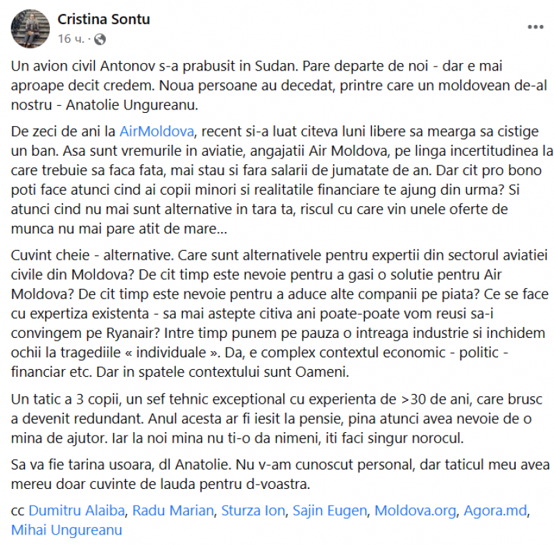 „Un avion civil Antonov s-a prăbușit în Sudan. Pare departe de noi – dar e mai aproape decât credem. Nouă persoane au decedat, printre care un moldovean de-al nostru – Anatolie Ungureanu.