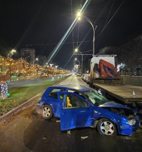 Grav accident în Chișinău. O mașină care aparține unei firme de taxi s-a răsturnat după ce s-a tamponat cu un alt autoturism.