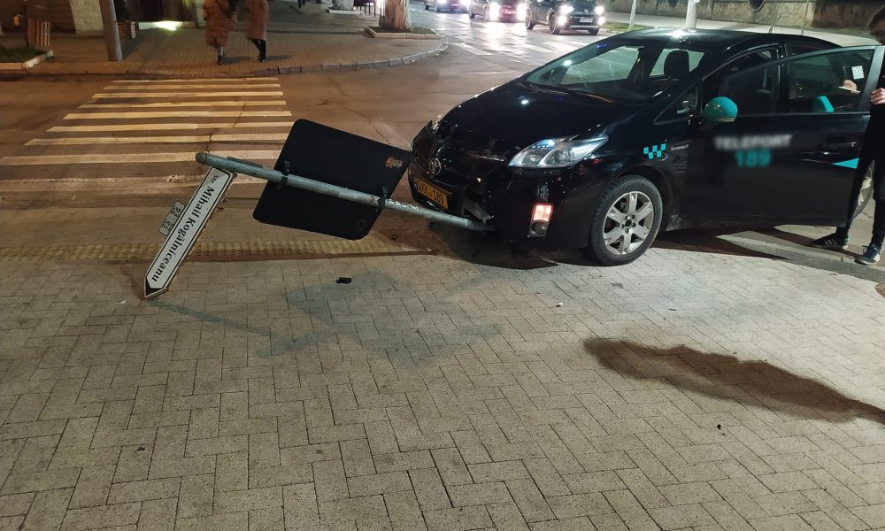 Accident, în centrul capitalei. Un taximetru a doborât un indicator stradal, după ce a fost lovit de un alt vehicul în spate.