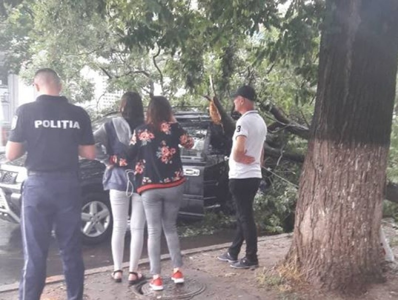 Ploaia a facut prăpăd astăzi în capitală. Vântul puternic a zmuls un copac din rădăcini. Arborele a cazut chiar peste o mașină parcată pe margina drumului.