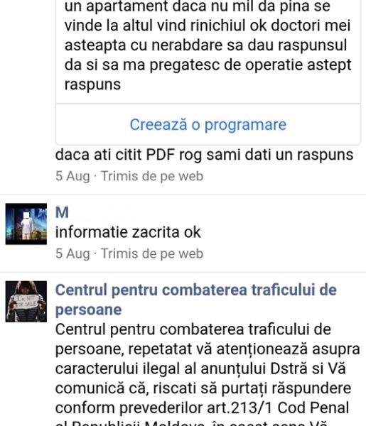 Potrivit poliției, în 2017 s-au înregistrat șase cazuri de vânzare a organelor. Plasarea acestor tipuri de anunțuri se pedepsește cu o amendă de până la 37 de mii 500 de lei.