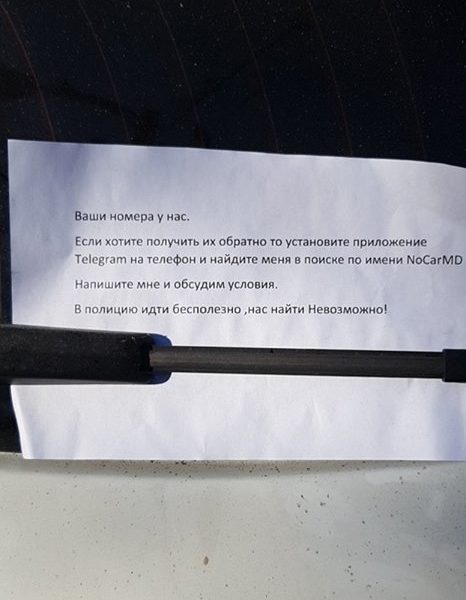 În locul numerelor a găsit, însă un bilet, cu indicații ce trebuie să facă ca să-și recupereze plăcuța. Hoții l-au prevenit pe bărbat că nu are nici un rost să anunțe poliția, deoarece ei sunt de negăsit.