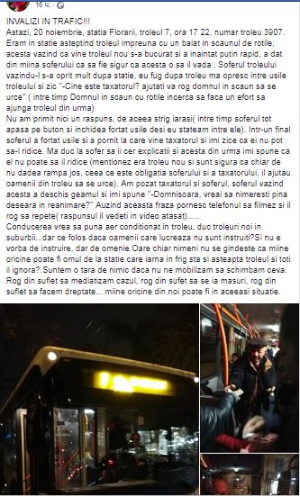 Când a observat acest lucru șoferul ar fi amenințat-o și i-ar fi spus că dacă nu încetează, până deseară va ajunge în reanimare. Într-un final, troleibuzul a plecat, iar bărbatul a rămas să aștepte în stație. Conducerea Regiei Transportului Electric a pornit o anchetă de serviciu pe acest caz.
