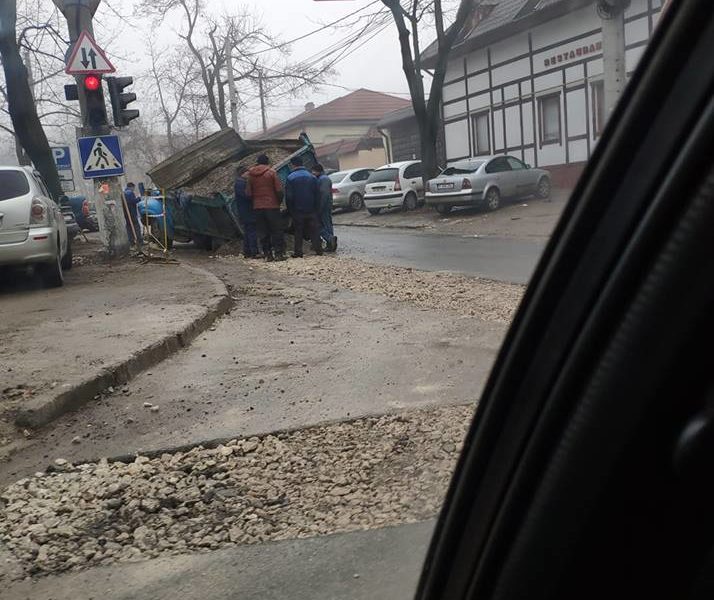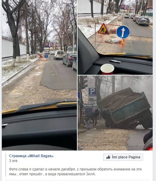Din imagini se vede mașina avariată, dar și câțiva muncitori. Cel mai probabil, camionul care a căzut, chiar era implicat în lucrările de asfaltare a gropilor din sectorul Centrul al Capitalei. Întrucât în remorcă se vede o cantitate mare de asfalt. Unul dintre internauți a atașat și alte poze cu locul unde a căzut autocamionul.