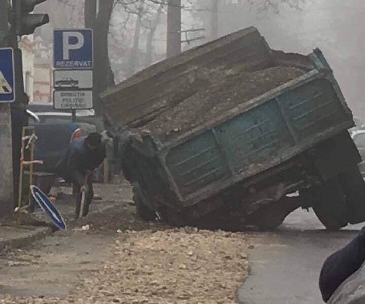 /FOTO/ Roata unui camion a fost ”înghițită” de o groapă din asfalt