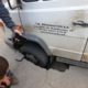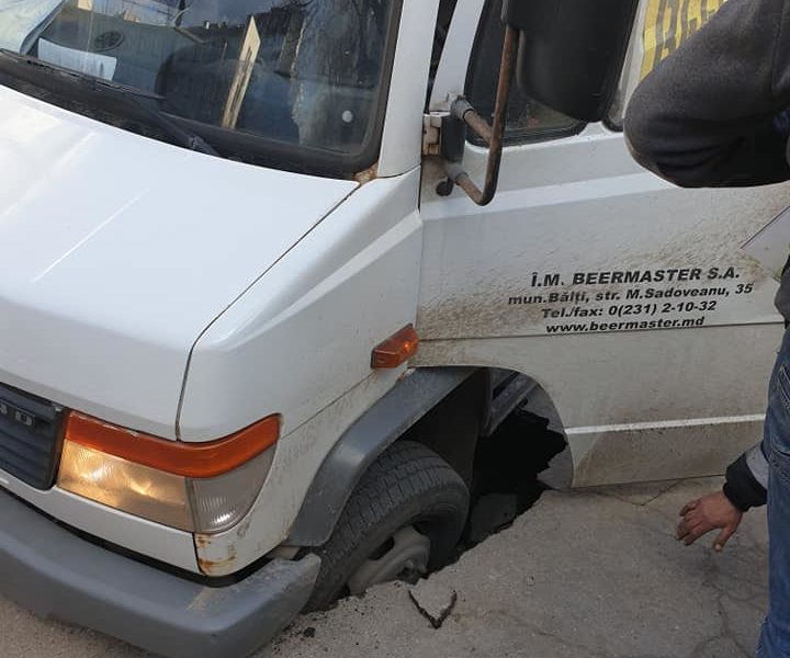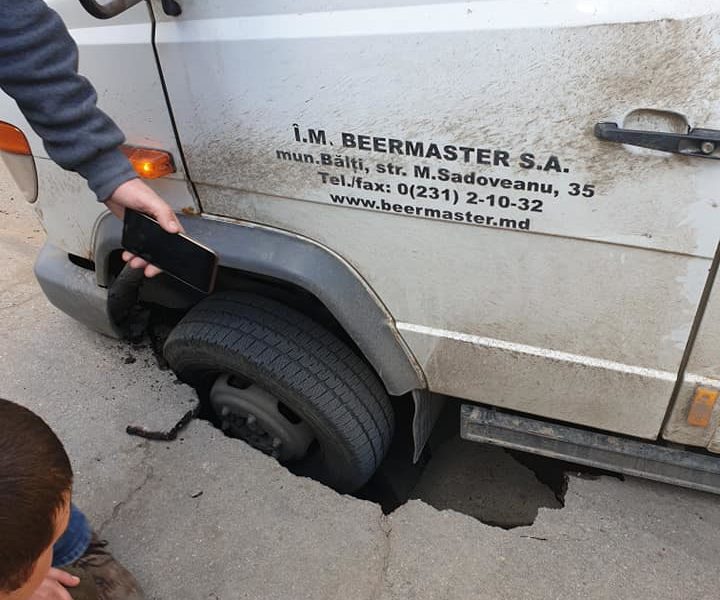 Roata unui microbuz a fost înghițită la propriu de asfalt. Pe o rețea de socializare au apărut imagini de la locul incidentului.