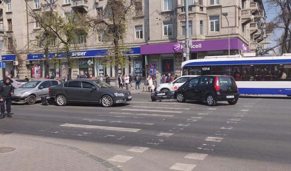Accident în lanţ, în centrul Capitalei. Trei mașini s-au tamponat violent la intersecţia bulevardului Ştefan cel Mare și Sfânt cu strada Armenească.