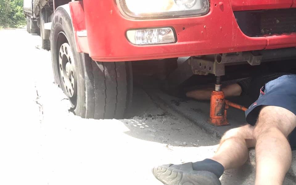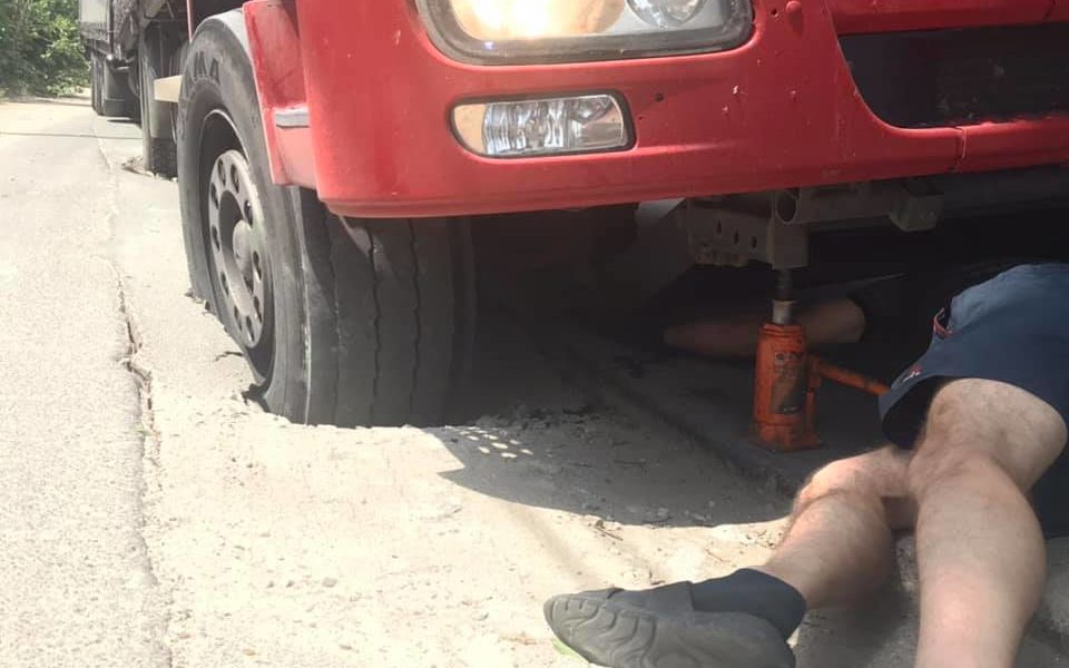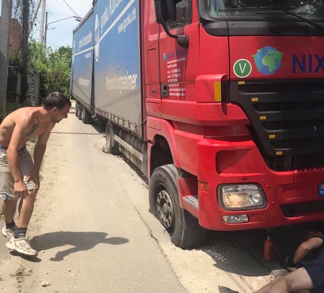 Minute de panică pentru un șofer de TIR. Asfaltul s-a surpat chiar în timp ce acesta se deplasa pe șosea.
