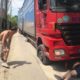 /VIDEO/ S-a surpat drumul sub roțile unui camion. Minute de panică pentru un șofer de TIR.
