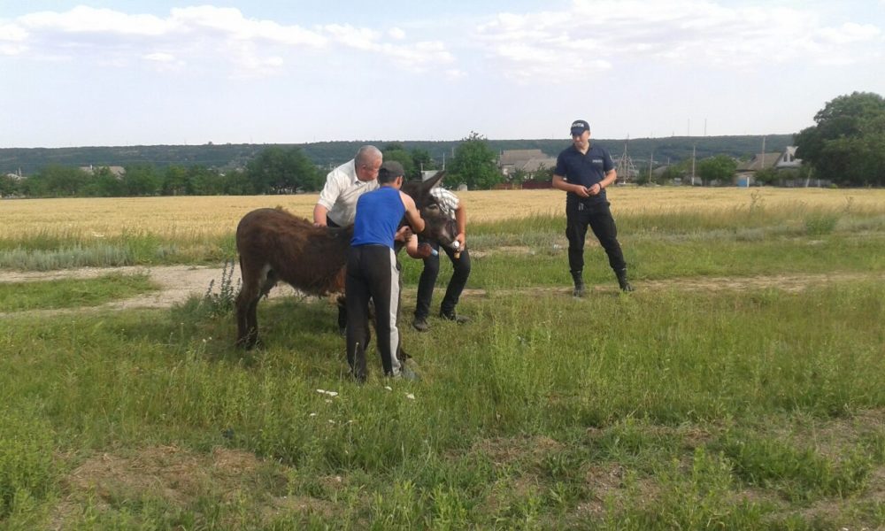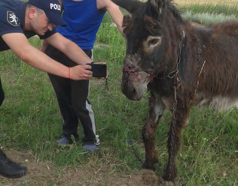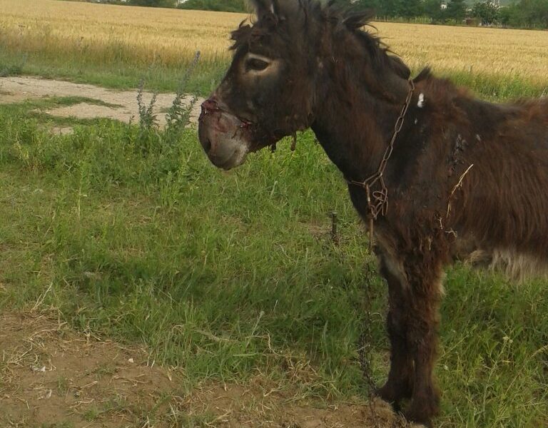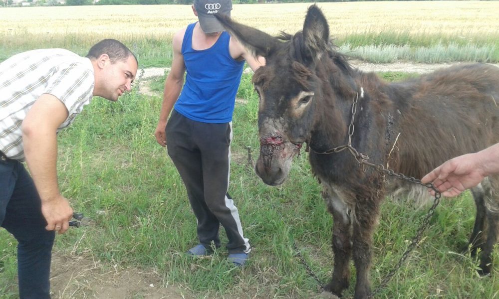 Un măgar plin de sânge și legat cu un lanț din metal a fost depistat pe un câmp din Taraclia.