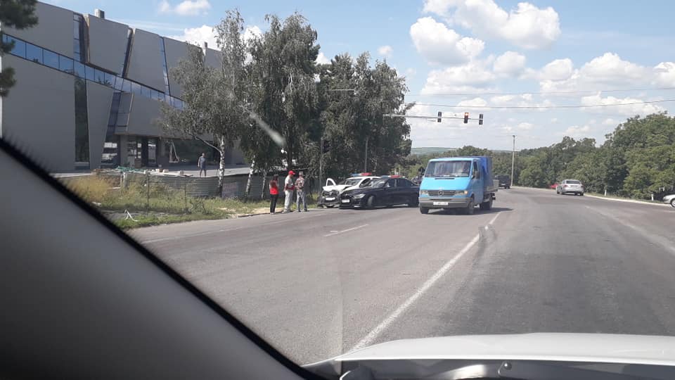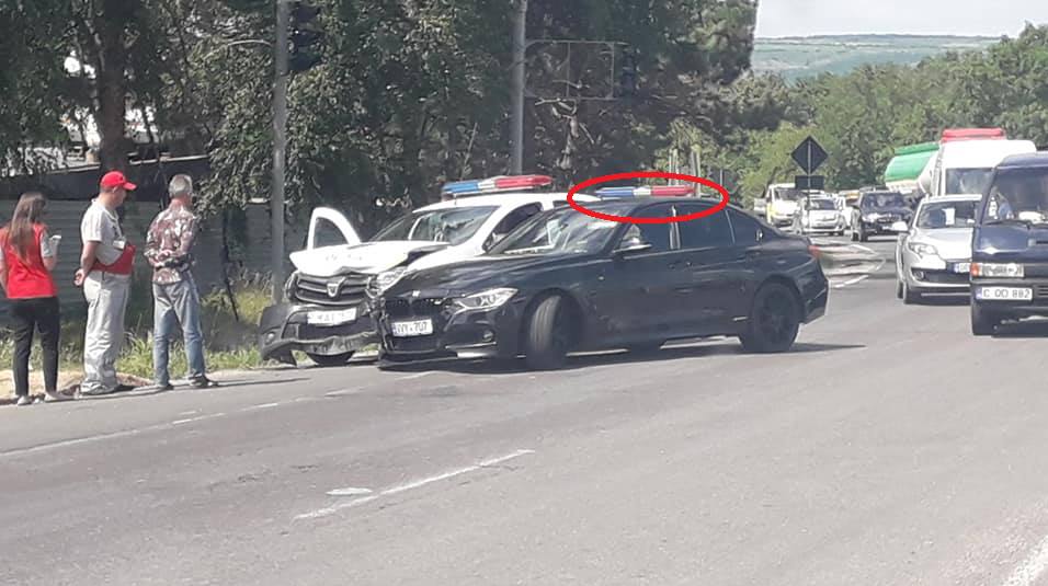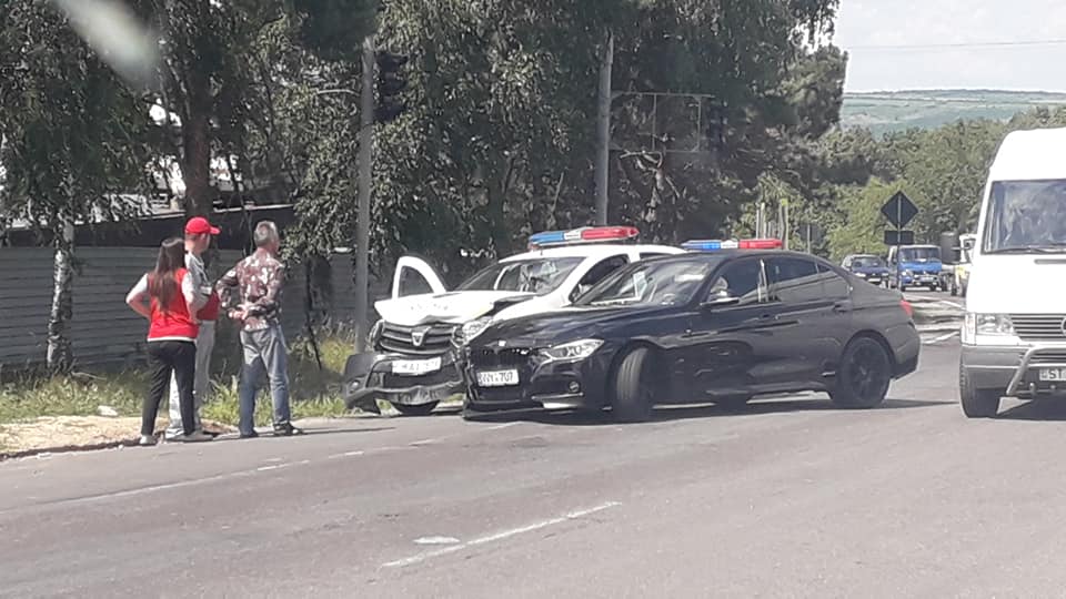 /FOTO/ Accident la Buiucani. Un BMW s-a tamponat cu o mașină a poliției. Încă un echipaj al poliției a venit la fața locului.