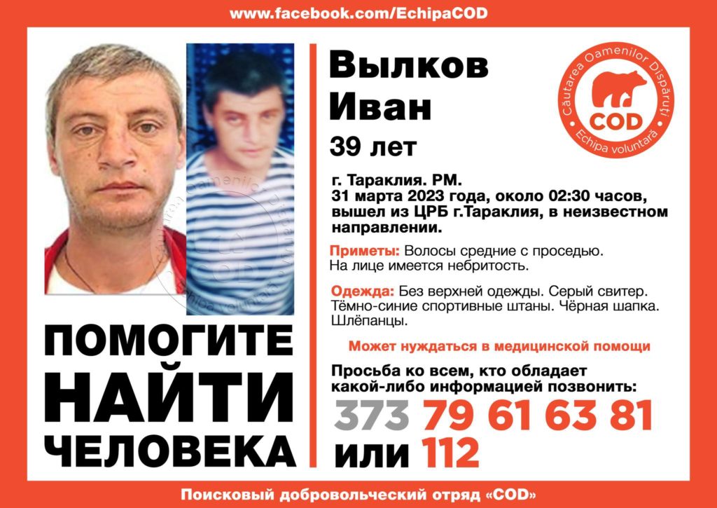 Echipa de căutare „COD” a anunțat dispariția lui Ivan Vylkov, un locuitor al orașului Taraclia. Bărbatul a fost eliberat pe 31 martie de la spitalul raional al orașului și încă nu s-a întors.