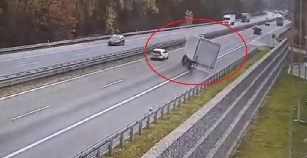 Imaginile surprinse de camerele de monitorizare arată cum autotrenul lovește parapeții din dreapta, virează brusc spre stânga și face ca semiremorca să derapeze violent, la un pas de a lovi un alt automobil. Incidentul s-a produs pe 11 noiembrie, în jurul orei 12:00, la kilometrul 70 al autostrăzii, între Praga și Brno.