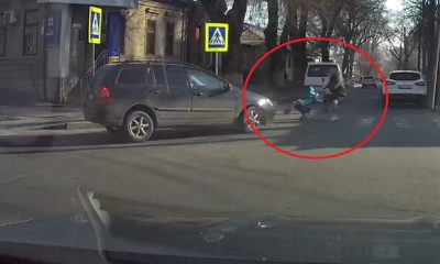 O femeie ce ducea un cărucior pentru copii a fost cât pe ce să fie luată pe capota unei mașini.