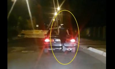 Distracții periculoase, pe o stradă din Chișinău. Un tânăr a fost filmat cum se plimbă pe ușa portbagajului unei mașini.