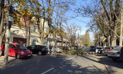 O creangă imensă s-a rupt de pe un copac și a căzut peste o mașină. Totul s-a întâmplat pe strada Armenească din Chișinău.