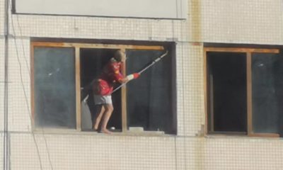 O femeie a fost surprinsă în timp ce spală geamul, stând pe un pervaz aflat la etajul șapte al unui bloc de locuit.