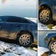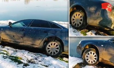 Încă un automobil de model Audi a spart gheața și a ajuns într-un râu.