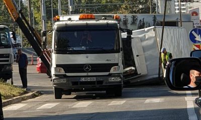 O manevră de virare nereușită s-a soldat cu un autocamion răsturnat pe strada Florilor, din capitală.