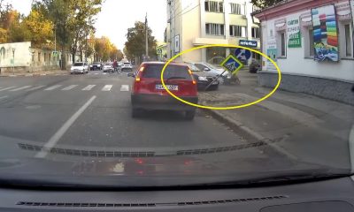 Moment de groază, filmat într-o intersecție din capitală. Două mașini s-au tamponat, iar un pieton a fost la un pas de a fi luat pe capotă.
