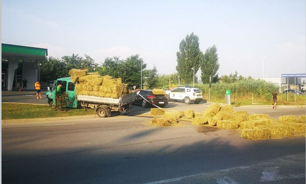 Și-a transformat bolidul de lux în car cu paie. Este isprava unei șoferițe care s-a izbit într-o camionetă încărcată cu furaje.