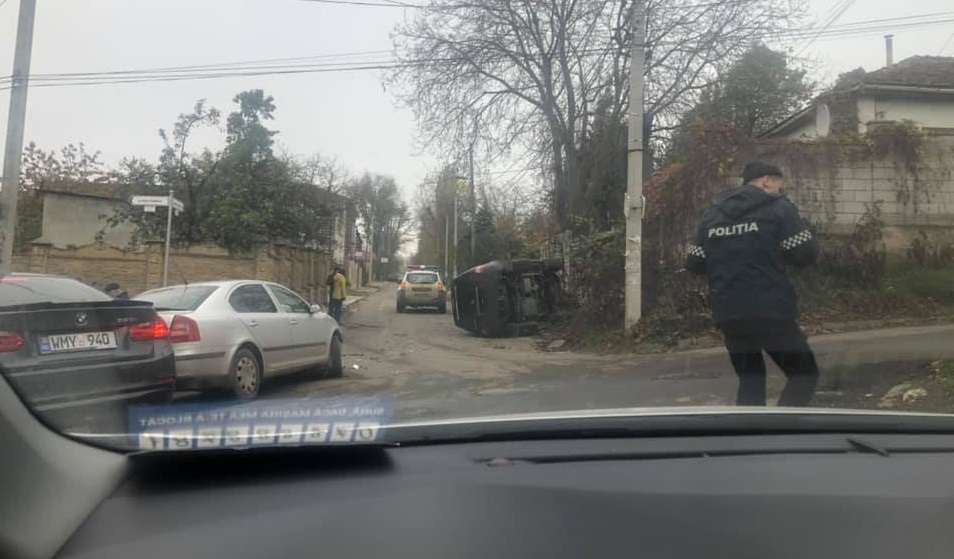 Accident cumplit, în capitală. O mașină s-a inversat, după ce s-a tamponat cu un alt autovehicul.