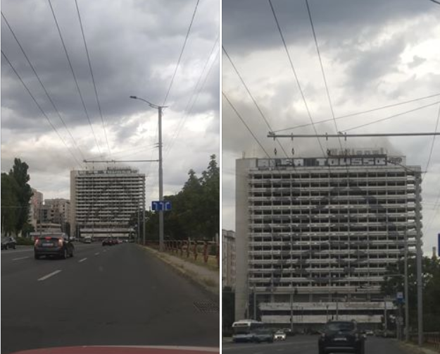 Incendiu declanșat în încăperea părăsită a hotelului Național din Chișinău. Fumul dens strecurat din ferestrele etajelor superioare, a fost imediat observat de trecători.