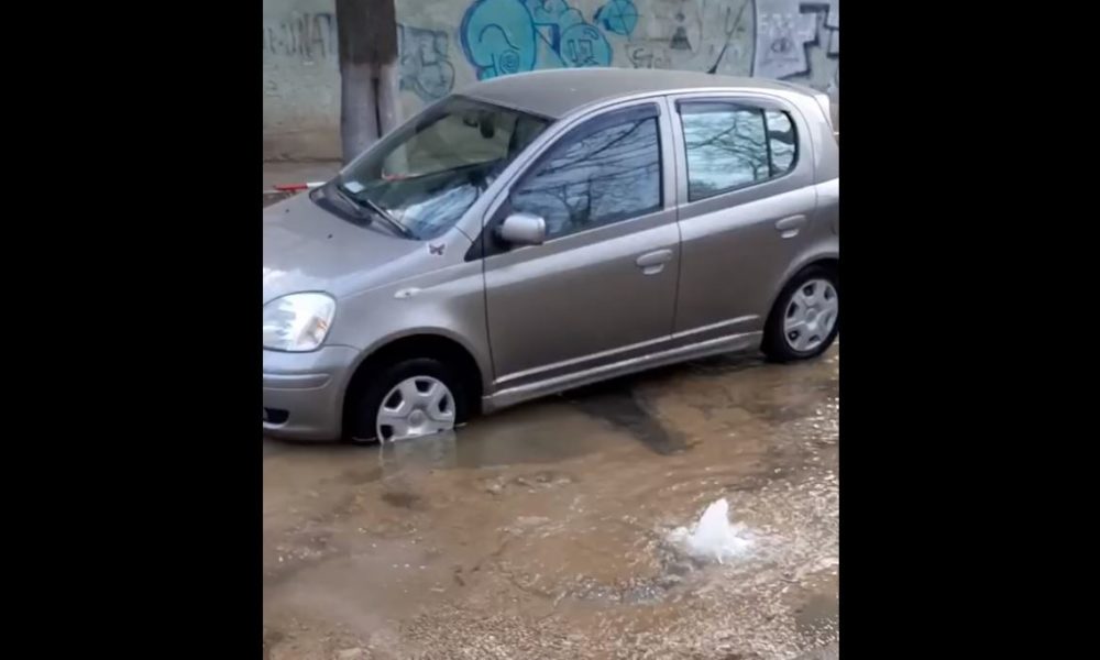 Ghinion pe capul unei șoferițe din capitală. Mașina ei s-a pomenit în mijlocul unei băltoace imense după ce o țeavă cu apă menajeră, ar fi cedat.