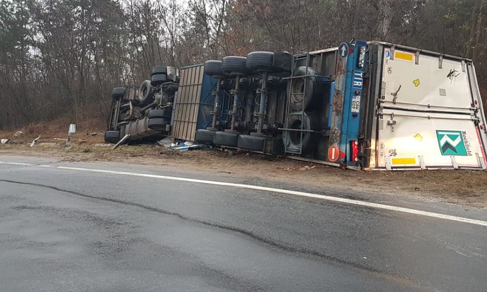 Un camion încărcat cu 14 tone de plastic s-a răsturnat pe traseu, lângă satul Fundul Galbenei din Hâncești