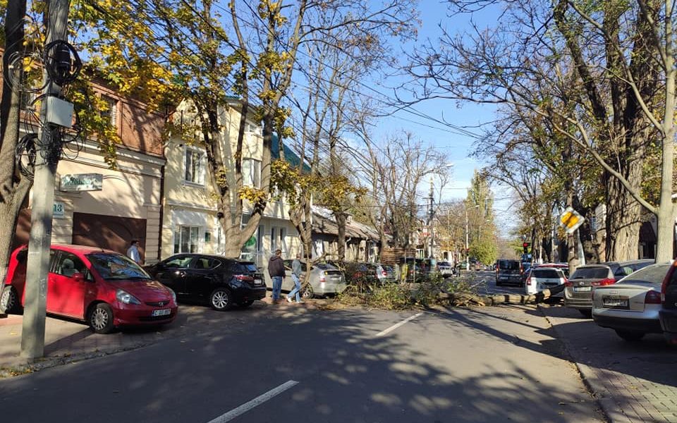 O creangă imensă s-a rupt de pe un copac și a căzut peste o mașină. Totul s-a întâmplat pe strada Armenească din Chișinău.