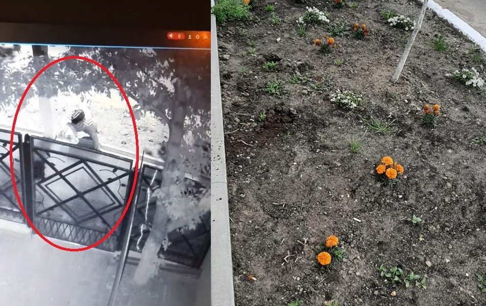 A pățit rușinea. O femeie a fost surprinsă de o cameră de supraveghere cum fură florile sădite pe o clumbă.