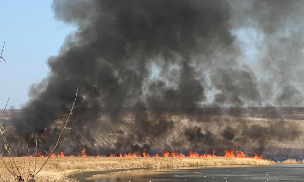 Incendiu de vegetație la Ghidighici. O suprafață extinsă de stuf din apropierea lacului a fost curprinsă de flăcări.