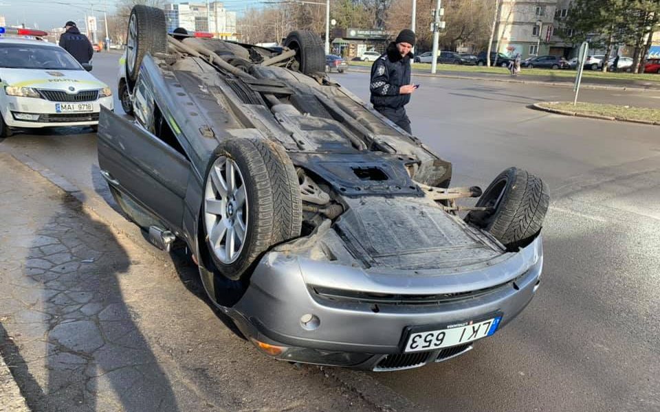 Un automobil de model BMW s-a răsturnat pe bulevardul Dacia din sectorul Botanica al Capitalei.