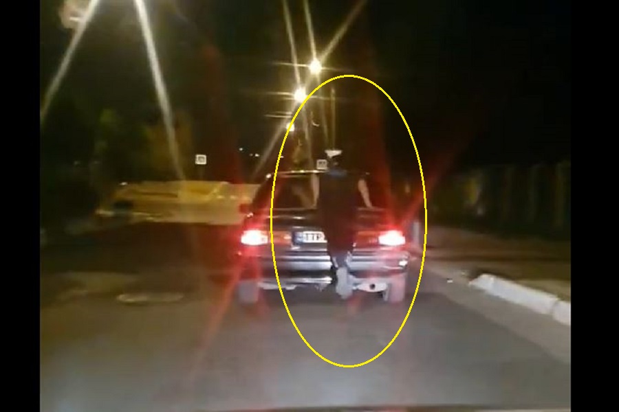 Distracții periculoase, pe o stradă din Chișinău. Un tânăr a fost filmat cum se plimbă pe ușa portbagajului unei mașini.