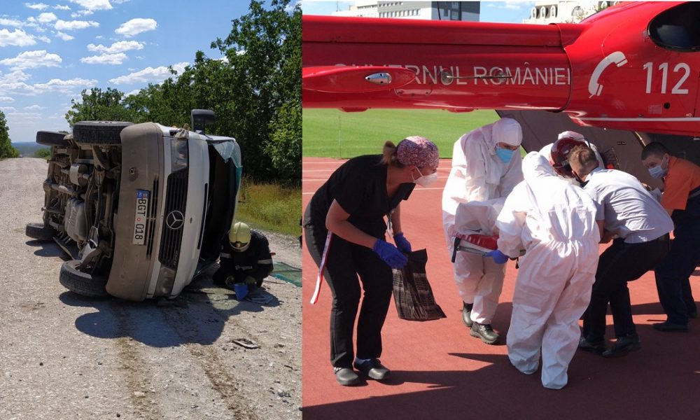Accident grav în raionul Sângerei. Un șofer a fost dus cu elicopterul SMURD la Chișinău după ce microbuzul pe care-l conducea s-a răsturnat.