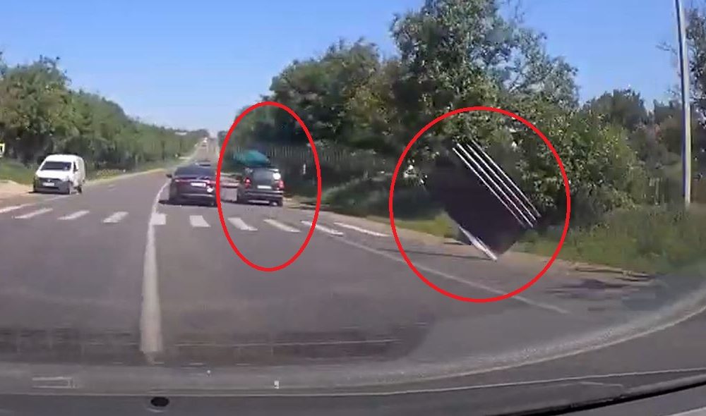 Momentul în care mai multe foi de țiglă metalică zboară de pe o mașină, din mers a fost surprins de o cameră de bord.