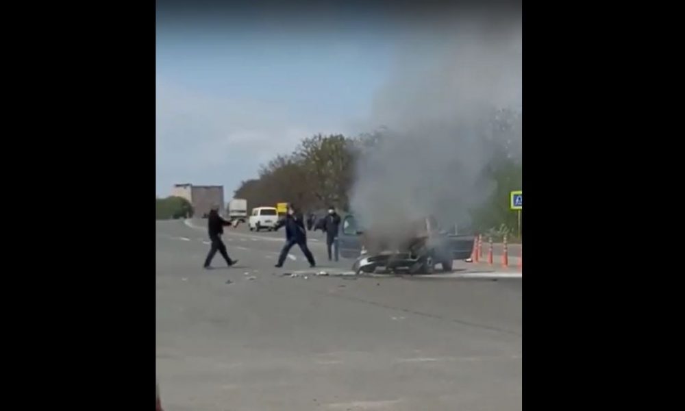 O mașină în flăcări a fost filmată cum arde în mijlocul drumului, la cercul de la intrarea în comuna Trușeni, municipiul Chișinău.