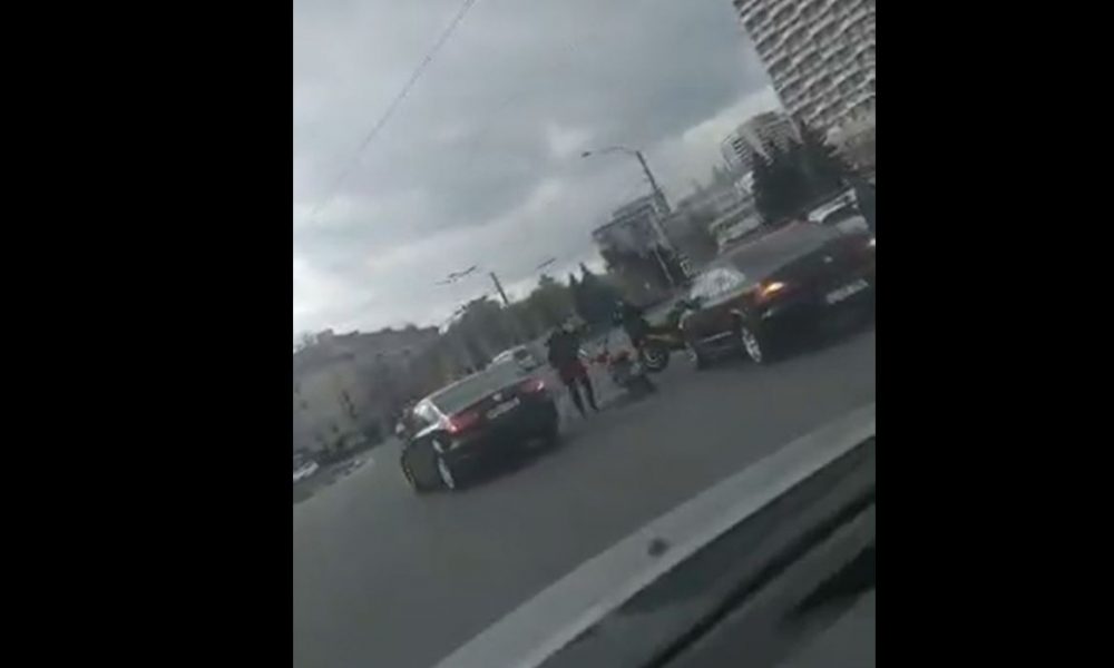 Accident lângă un centru comercial din centrul capitalei. O motocicletă s-a tamponat cu o mașină