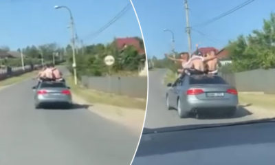 Mai mulți tineri au fost surprinși cum se plimbă pe acoperișul unui automobil, într-o localitate din țară.