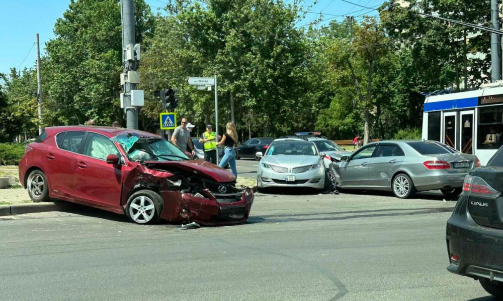 Carambol în capitală. Trei mașini au fost făcute zob, după ce s-au ciocnit violent la intersecția străzilor Traian și Independenței din sectorul Botanica.