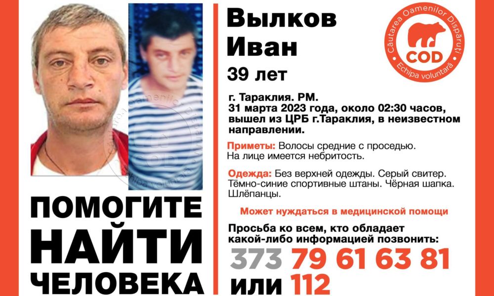 Echipa de căutare „COD” a anunțat dispariția lui Ivan Vylkov, un locuitor al orașului Taraclia. Bărbatul a fost eliberat pe 31 martie de la spitalul raional...
