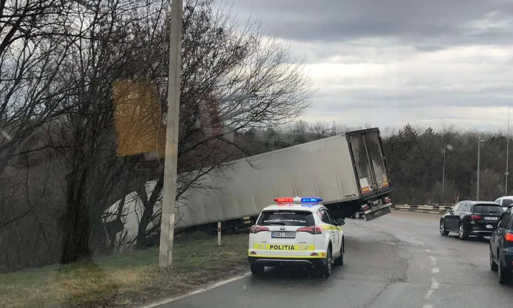 Vremea instabilă dă bătăi de cap șoferilor. Un TIR a derapat de pe șoseaua umedă și a ajuns în șanțul de pe marginea drumului.