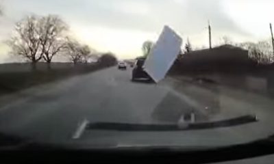 Moment periculos surprins în trafic. Un șofer a fost la un pas de a nimeri în accident după ce o placă de rigips ce era transportată...