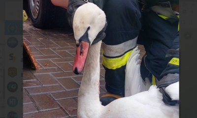 O lebădă a fost salvată de pompieri după ce a căzut într-un canal de evacuare a apei.
