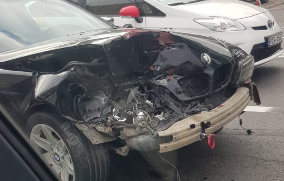 Accident grav, în capitală. Un automobil a rămas practic fără partea din față după impactul cu o altă mașină.