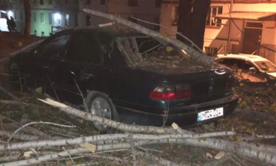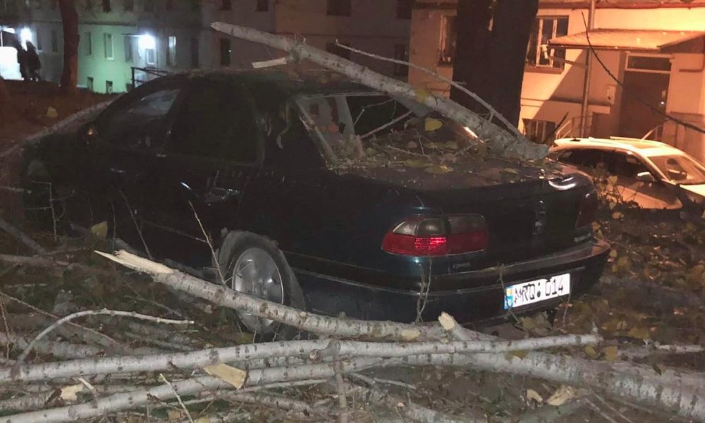 Ghinion pentru un șofer din Capitală. Mai multe crengi uriașe au fost rupte de rafalele de vânt și au căzut direct peste mașina lui.