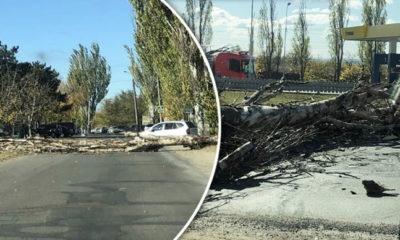 Un copac a fost doborât la pământ chiar din rădăcini, blocând astfel complet un drum.