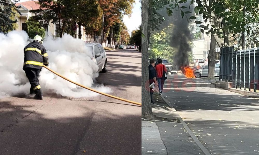 Dimineață încinsă în centrul capitalei. O mașină a fost distrusă de flăcări.