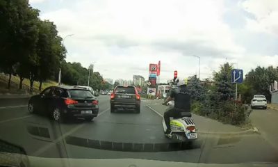 Karma momentană: Un șofer a trecut peste două linii continue fără să observe echipajul de poliție în spatele său.