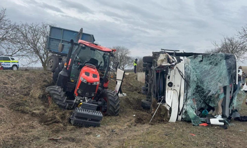Și-au văzut moartea cu ochii. Pasagerii unui autocar au tras o sperietură zdravănă, după ce vehiculul în care se aflau s-a tamponat cu un tractor.